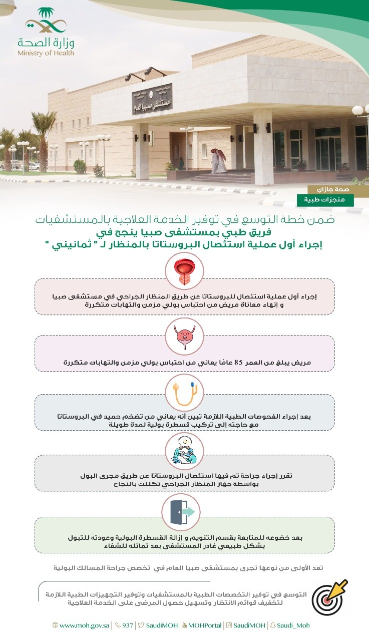 نجح فريق جراحة المسالك البولية بمستشفى صبيا العام في إنهاء معاناة مريض ثمانيني يعاني من إحتباس بولي مزمن وإلتهابات متكررة وذلك عبر إجراء أول عملية إستئصال للبروستات عن طريق جهاز المنظار الجراحي في مستشفى صبيا تكللت بالنجاح .