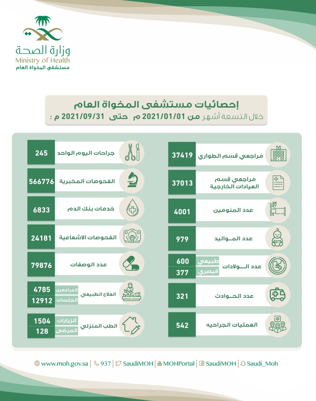أشارت الإحصائيات الصادرة عن مستشفى المخواة العام خلال الفترة من 1/1/2021م حتى 31/9/2021م عن إستقبال قسم الطوارئ 37419 حالة بينما إستقبلت العيادات الخارجية 37013 مراجع وبلغ عدد المنومين 4001 مريض كما تم اجراء 542عملية جراحية وعدد الفحوصات المخبرية 566776 فحص وبلغ عدد الفحوصات الإشعاعية 24181 فحص وعدد الوصفات 79876 وصفة كما بلغ عدد المواليد 779 وعدد خدمات بنك الدم 6833 وجراحات اليوم الواحد 245 وبلغ عدد الحوادث 321 و عدد الولادات الطبيعية 600بينما بلغ عدد القيصرية 377 وبلغ عدد الجلسات بعيادة العلاج الطبيعي 12912 جلسة بينما بلغ عدد المراجعين 4785 مراجع وبلغ عدد الزيارات بعيادة الطب المنزلي 1504زيارة بينما بلغ عدد المرضى 128 مريض.