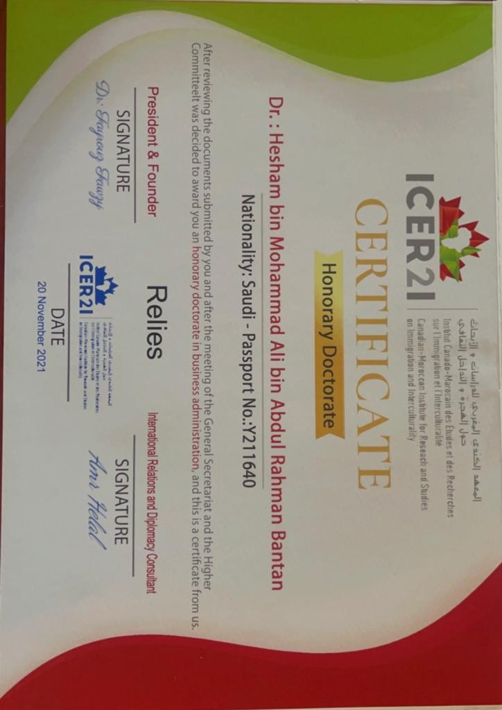حصل الدكتور هشام علي بنتن سفير النوايا الحسنة ورجل الأعمال على الدكتوراة الفخرية في إدارة الأعمال من الجامعة الكندية.