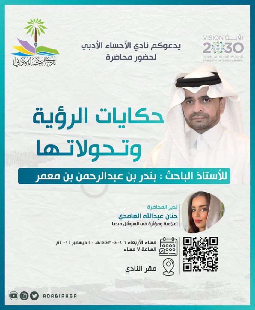 ينظم نادي الأحساء الأدبي محاضرة بعنوان "حكاية الرؤية وتحولاتها" للباحث بندر بن معمر، الساعة السابعة من مساء الأربعاء القادم، في مقر النادي في مدينة المبرز، بإدارة الإعلامية حنان الغامدي.
