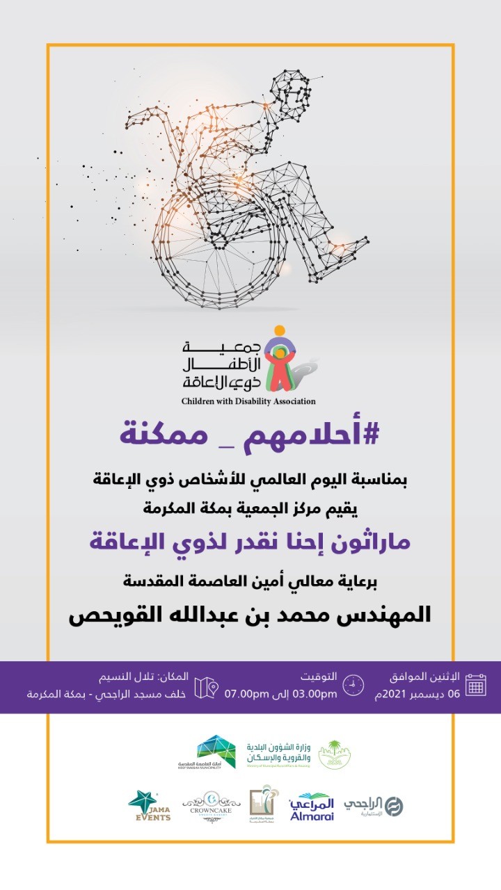 برعاية  أمين العاصمة المقدسة المهندس محمد بن عبدالله القويحص تقيم جمعية الأطفال ذوي الإعاقة بمركز مكة المكرمة وبمناسبة اليوم العالمي للأشخاص ذوي الإعاقة:( ماراثون حنا نقدر لذوي الإعاقة).