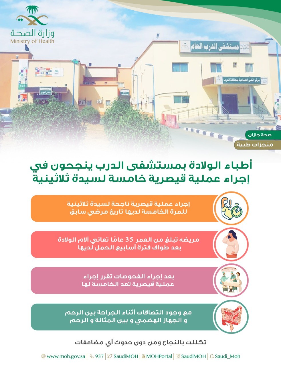 تمكن أطباء النساء والولادة بمستشفى الدرب العام بجازان من إجراء عملية قيصرية ناجحة لسيدة ثلاثينية لديها تاريخ مرضي سابق، إضافة إلى أن هذه العملية تعد القيصرية الخامسة التي تجرى للسيدة دون حدوث أي مضاعفات ولله الحمد.