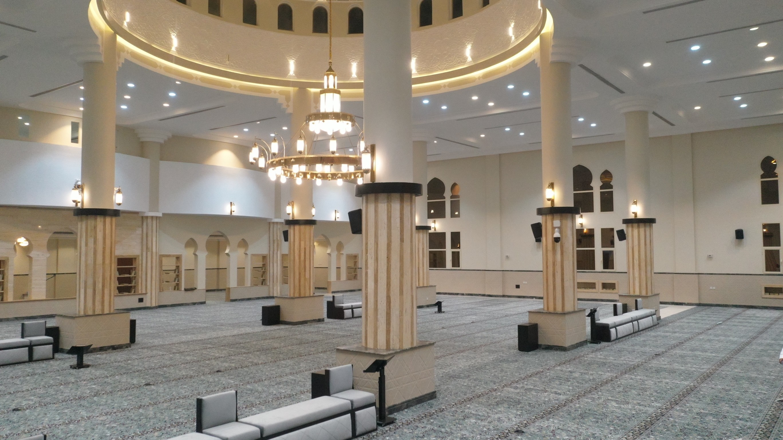 ويحتوي على منارتين بارتفاع 32 م.ط، كما يحوي على قبة كُتب بها أسماء الله الحسنى بارتفاع 8 م من سطح المبنى، وعلى مساحة 120 م٢. ويحتوي الموقع على ساحات، ومواقف للسيارات، ومواقف خاصة للإمام والخطيب، ومواقف خاصة لذوي الهمم العالية بما مساحته 5000 م2.