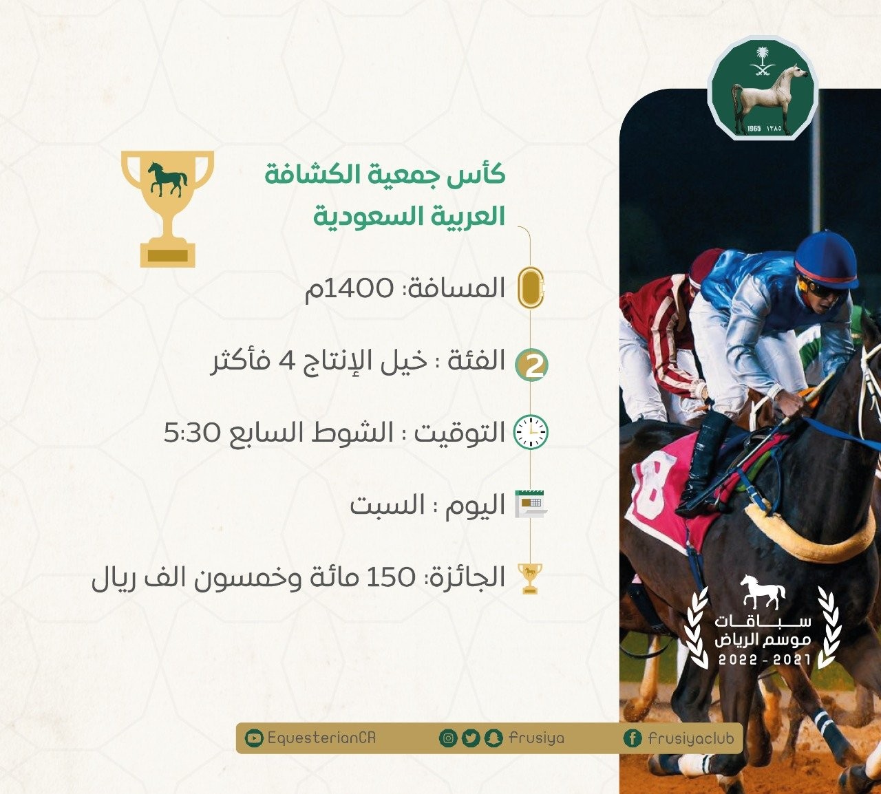 تتنافس 11 جواداً للحصول على كأس جمعية الكشافة العربية السعودية ضمن حفل السباق رقم ( 51 ) الذي يُقيمه نادي سباقات الخيل يوم غداً السبت على ميدان الملك عبدالعزيز بالجنادرية لموسم 1443/ 1444هـ .
