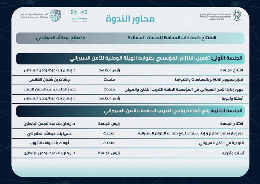 والتي تهدف لتعزيز الوعي والثقافة بضوابط الهيئة الوطنية للأمن السيبراني لدى منسوبي المؤسسة العامة للتدريب التقني والمهني والتعريف بالإطار السعودي للتعليم العالي في الأمن السيبراني(سايبر التعليم) والتعريف بالإطار السعودي لكوادر الأمن السيبراني(سيوف) ودور الأطر في تأهيل ورفع كفاءة الكوادر السيبرانية والتوعية في الأمن السيبراني.