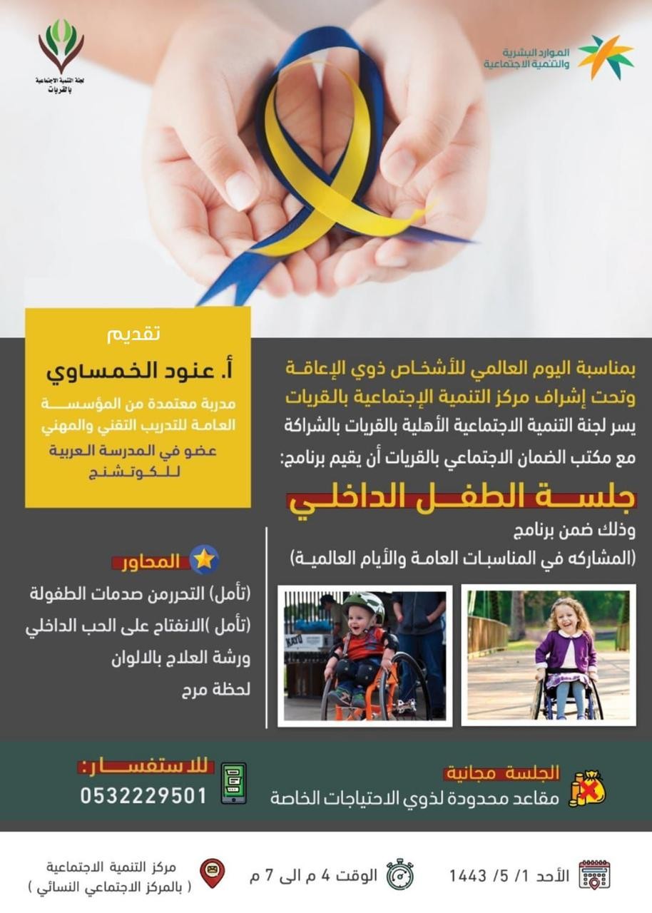 أقامت لجنة التنمية الإجتماعية الأهلية بمحافظة القريات بالشراكة مع مكتب الضمان الإجتماعي بالقريات فعالية ( جلسة الطفل الداخلي )، نفذتها المدربة العنود الخمساوي حيث سلطت الضوء على معنى الطفل الداخلي وشرحت ( لا يعتبر مفهوم الطفل الداخلي حديثاً! بل يرجع الاهتمام بانعكاس تجارب الطفولة على الشخصية إلى عصور قديمة، لكن هذا الاهتمام تبلور وأثمر مع مدرسة التحليل النفسي، حيث يعتبر عالم النفس الكبير كارل يونغ صاحب الفضل بوضع مفهوم الطفل الداخلي وعلاج الطفل الداخلي في علم النفس الحديث ) ، وتخلل الفعالية التأمل لتحرر من صدمات الطفولة وكذلك تأمل الإنفتاح على الحب الداخلي ،وورشة للعلاج بالألوان.