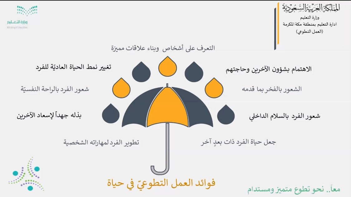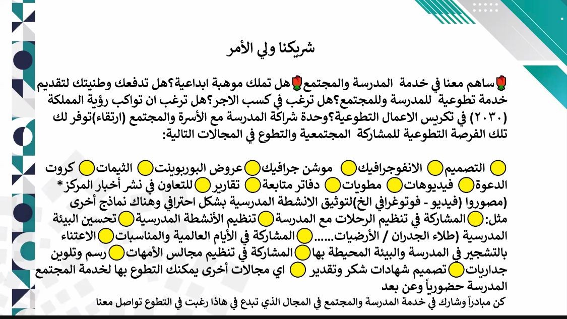 سلطت الضوء من خلالها على مفهوم التطوع ومجالاته وأهمية مشاركة أولياء الأمور في هذا المجال وطريقة التسجيل في منصة العمل التطوعي