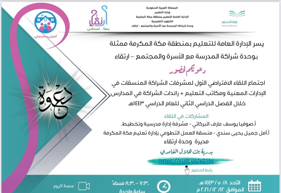 بحضور أكثر من ٣٠٠ مشرفة ورائدة شراكة في الإدارات التعليمية ومكاتب التعليم والمدارس والروضات لعام ١٤٤٣هـ عقدت الإدارة العامة للتعليم بمنطقة مكة المكرمة ممثلة في وحدة شراكة المدرسة مع الأسرة والمجتمع (ارتقاء)-بنات- مساء اليوم الأحد الموافق ١٤٤٣/٥/٨هـ اللقاء الافتراضي الأول للفصل الدراسي الثاني نفذته مديرة وحدة ارتقاء بدرية الغامدي عن بعد* عبر برنامج الزوم بالتعاون مع (إدارة التدريب والابتعاث/. وحدة تطوير المدارس/ إدارة الموارد البشرية) .