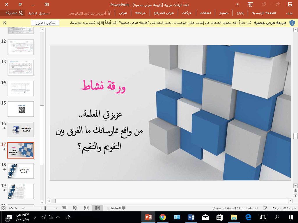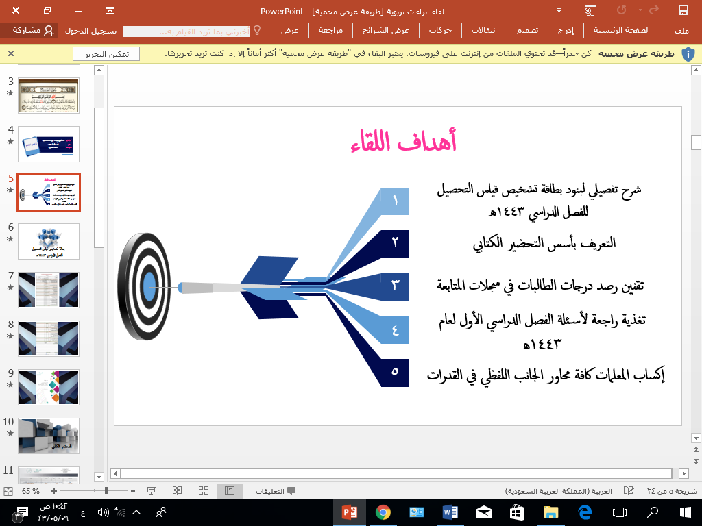 هذا وقد تضمن اللقاء بطاقة تشخيص قياس التحصيل للفصل الدراسي 1443هـ، والتحضير الكتابي، والتعريف بسجلات المتابعة وتقنين الدرجة المستحقة، وتقديم تغذية راجعة حول أسئلة مقننة، وحول محور بقدراتي أتميز ختم اللقاء الإثرائي.