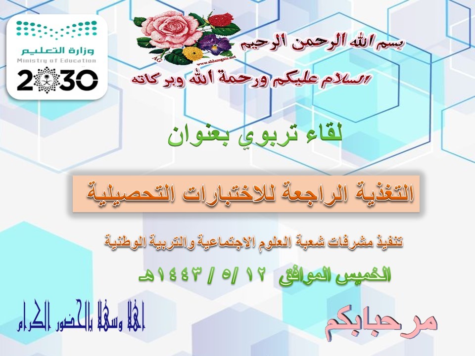 عقدت الإدارة العامة للتعليم بمنطقة مكة المكرمة ممثلة في مكتب تعليم شرق مكة اللقاء التربوي بعنوان(التغذية الراجعة في الاختبارات التحصيلية) اليوم الخميس الموافق 1443/5/12هـ، نفذته مشرفات العلوم الاجتماعية والوطنية تحت إشراف مديرة المكتب أمل باجابر .