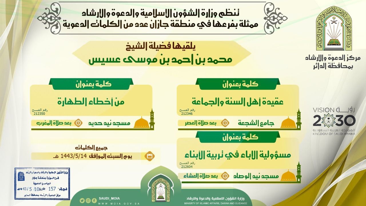 ينظم فرع  وزارة الشؤون الإسلامية والدعوة والإرشاد ممثلة بمركز الدعوة والإرشاد بمحافظة الداير بني مالك " ثلاث كلمات دعوية مساء غدٍ السبت الموافق 14 / 5 / 1443 هـ , يُلقيها فضيلة الشيخ محمد بن أحمد عسيس والتي تنطلق بعد صلاة العصر وتستمر إلى بعد صلاة العشاء يتحدث  خلالها عن موضيع مهمة  وهي عقيدة أهل السنة والجماعة و أخطاء الطهارة ويختتمها بالحديث عن مسؤلية الآباء في تربية الأبناء .