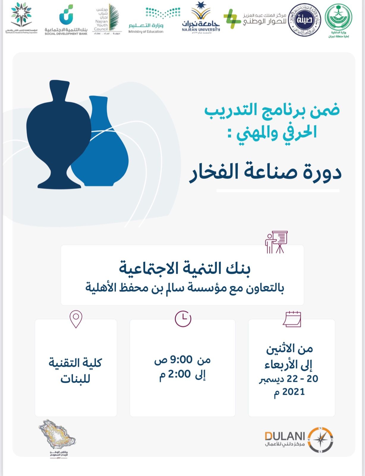 يقدم بنك التنمية الاجتماعية بالتعاون مع مؤسسة سالم بن محفوظ الأهلية برنامج التأهيل المهني والحرفي "صناعة الفخار" ، وذلك ضمن الشراكة الفاعلة مع ملتقى الوطن للإبداع السعودي.