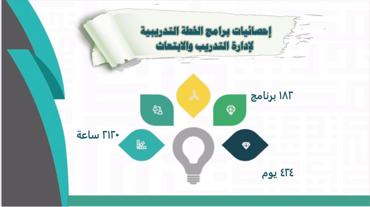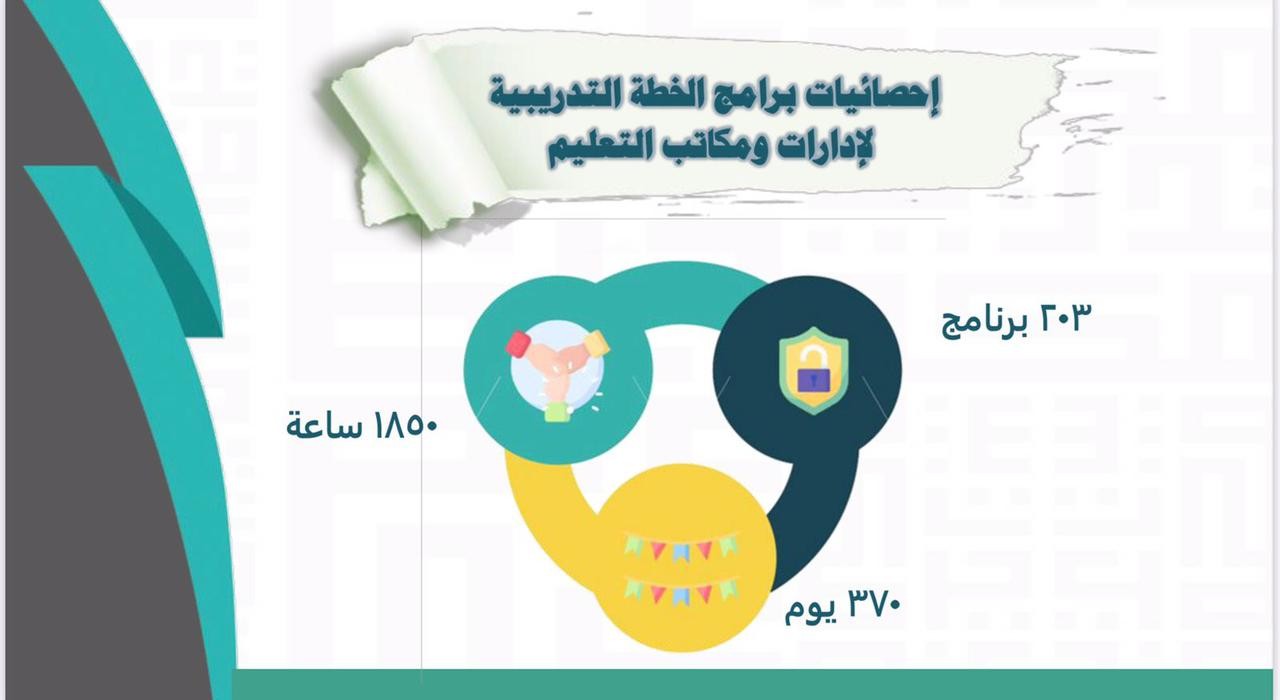 وقد شملت الخطة كذلك العديد من البرامج التربوية والتقنية الملائمة لمتطلبات الميدان التربوي والتعليمي والتقنية بواقع (3970) ساعة تدريبة خلال (794) يوم حيثُ تتوافق مع التقويم الدراسي الجديد الذي أقرته وزارة التعليم للعام 1443هـ، إذ بلغت إحصائيات برامج الخطة التدريبية لإدارة التدريب والابتعاث (2120) ساعة تدريبية خلال (424) يوماً تدريبياً، وبلغت إحصائيات برامج الخطة التدريبية لإدارات ومكاتب التعليم 1850) ساعة تدريبية خلال (370) يوماً تدريبياً.)