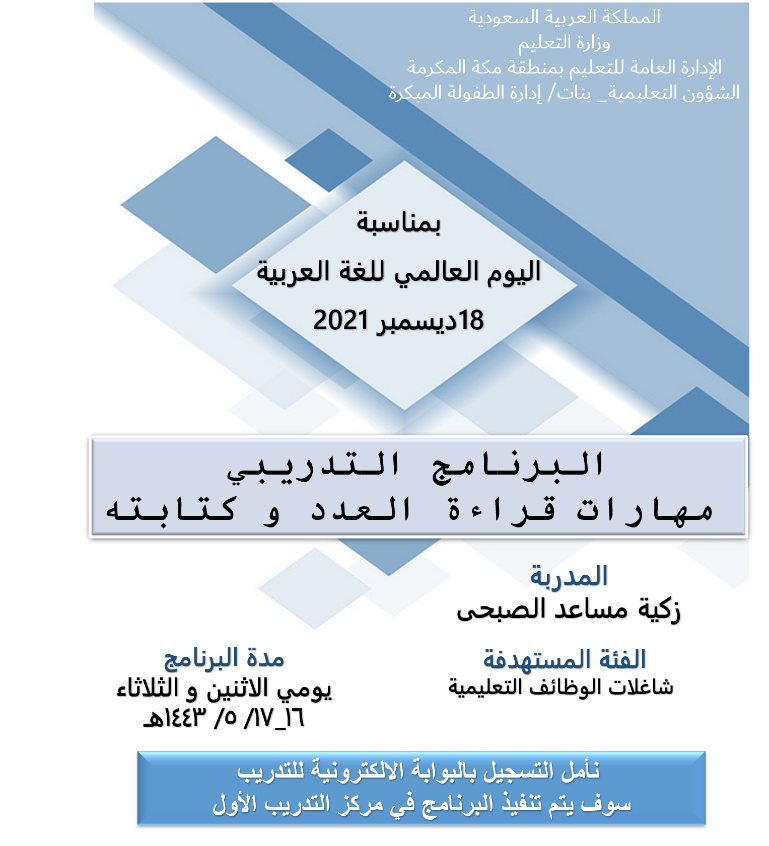 نفذت الإدارة العامة للتعليم بمنطقة مكة المكرمة ممثلة بإدارة الطفولة المبكرة لمدة يومين إبتداءً من يوم الإثنين الموافق 16 / 5 / 1443هـ، برنامجاً تدريبياً بعنوان مهارات قراءة العدد وكتابته نفذهُ مديرة الإدارة زكية الصبحي.