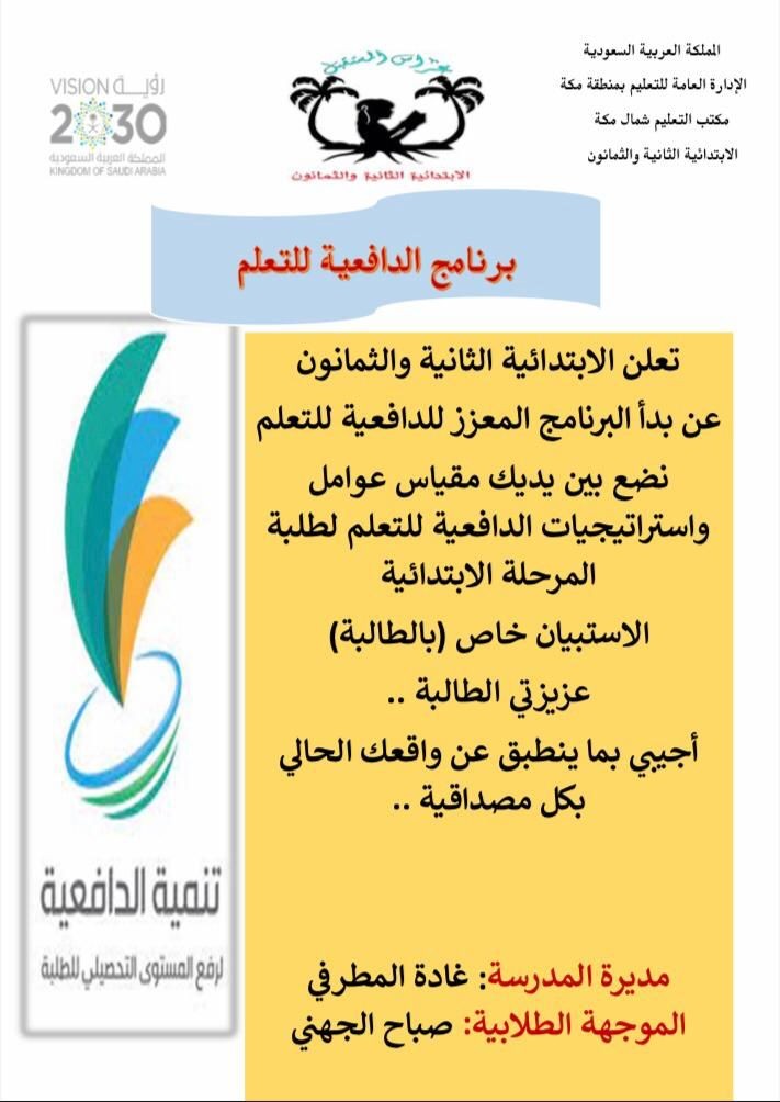 فعلت الابتدائية الثانية والثمانون التابعة لمكتب تعليم شمال مكة بالإدارة العامة للتعليم بمنطقة مكة المكرمة يومي الإثنين والثلاثاء الموافق 16-17/ 5/ 1443هـ ، برنامجاً إرشادياُ بعنوان المعزز لدافعية التعلم من قبل المرشدة الطلابية صباح الجهني، وبمتابعة من مديرة المدرسة غادة المطرفي.