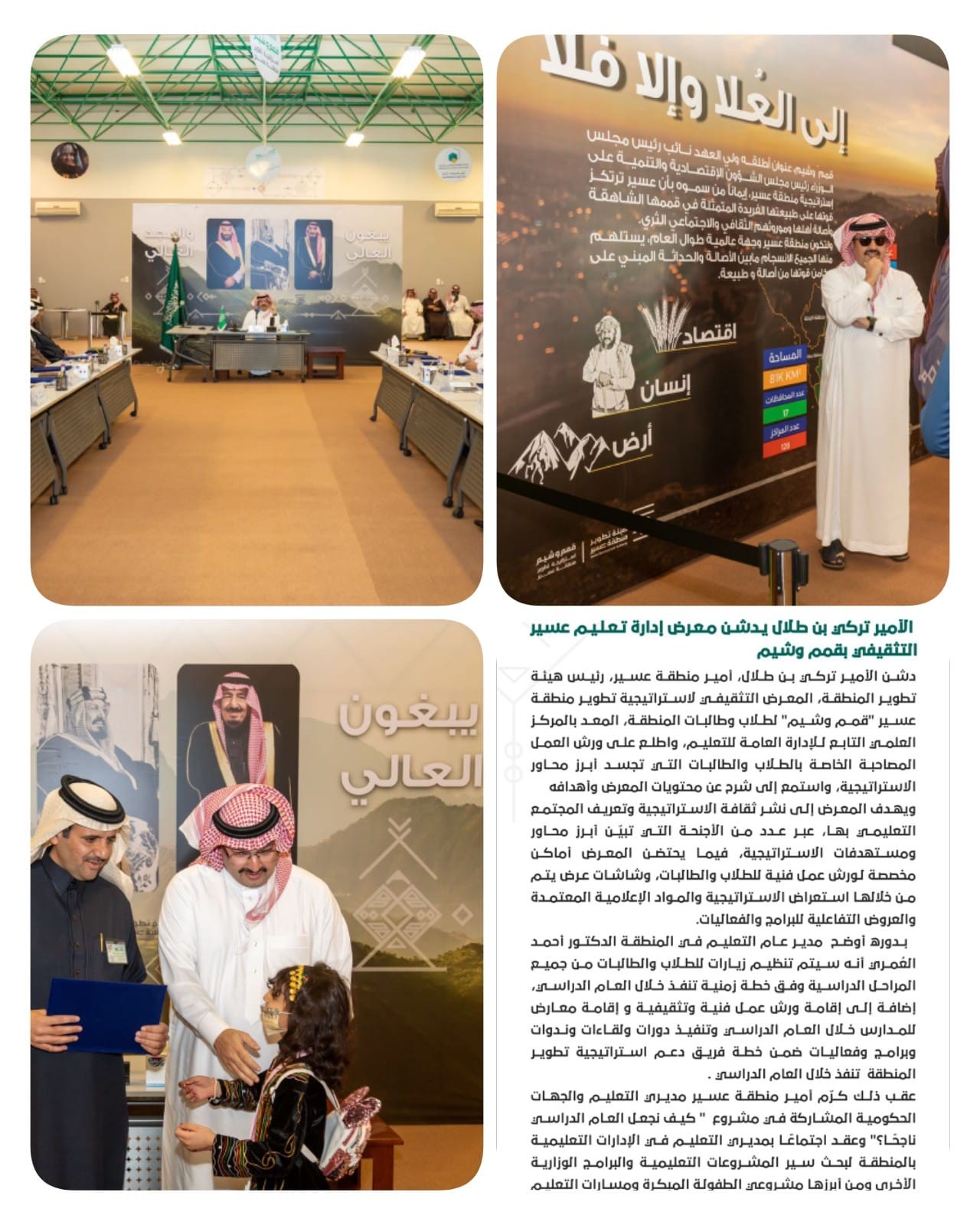 دشن الأمير تركي بن طلال أمير منطقة عسير رئيس هيئة تطوير المنطقة المعرض التثقيفي لاستراتيجية تطوير منطقة عسير "قمم وشيم" لطلاب وطالبات المنطقة المعد بالمركز العلمي التابع للإدارة العامة للتعليم واطلع على ورش العمل المصاحبة الخاصة بالطلاب والطالبات التي تجسد أبرز محاور الاستراتيجية، واستمع إلى شرح عن محتويات المعرض وأهدافه.