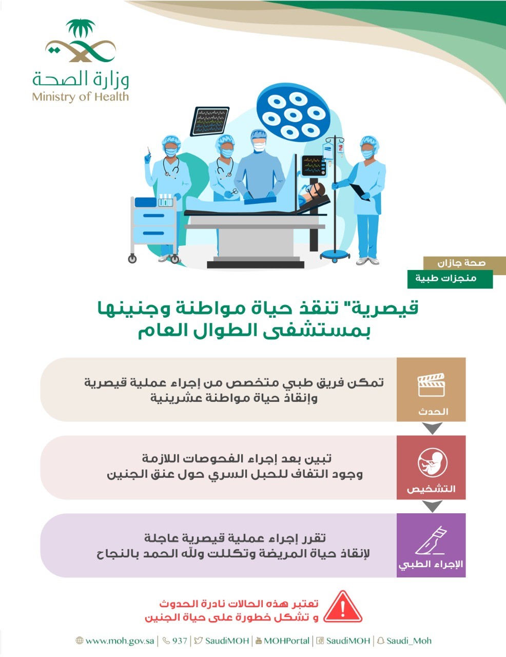 وأضافت بأنه على الفور قرر الفريق الطبي إجراء عملية قيصرية عاجلة لإنقاذ حياة المواطنة وتكللت ولله الحمد بالنجاح.