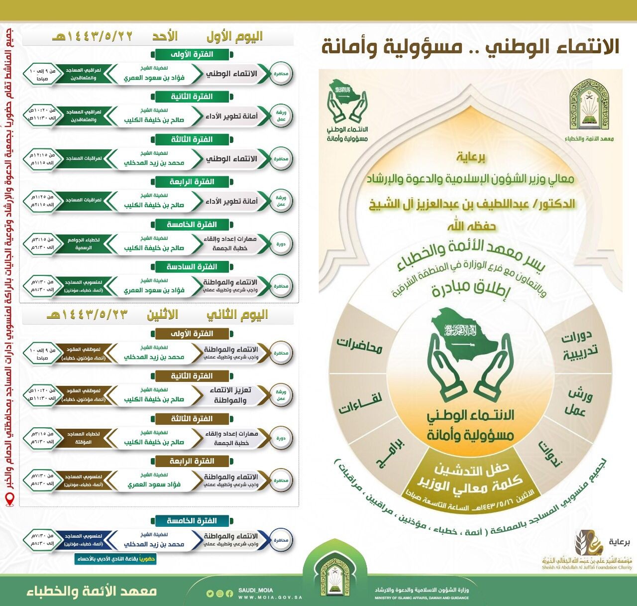 تباشر وزارة الشؤون الاسلامية والدعوة والارشاد ممثلة بمعهد الائمة والخطباء وبالتعاون مع فروع الوزارة بمختلف مناطق المملكة تنفيذ مبادرة ( الانتماء الوطني مسؤولية وامانة ) يوم غد الأحد والتي دشنها معالي الوزير الدكتور عبداللطيف بن عبدالعزيز آل الشيخ مؤخراً ، وتتضمن مجموعة من المحاضرات يقدمها نخبة من الدعاة والمختصين والاكاديميين وتستهدف قرابة 100 ألف مابين إمام ومؤذن وخطيب وأكثر من " 11 " ألف مراقب ومراقبة بعموم مناطق المملكة .