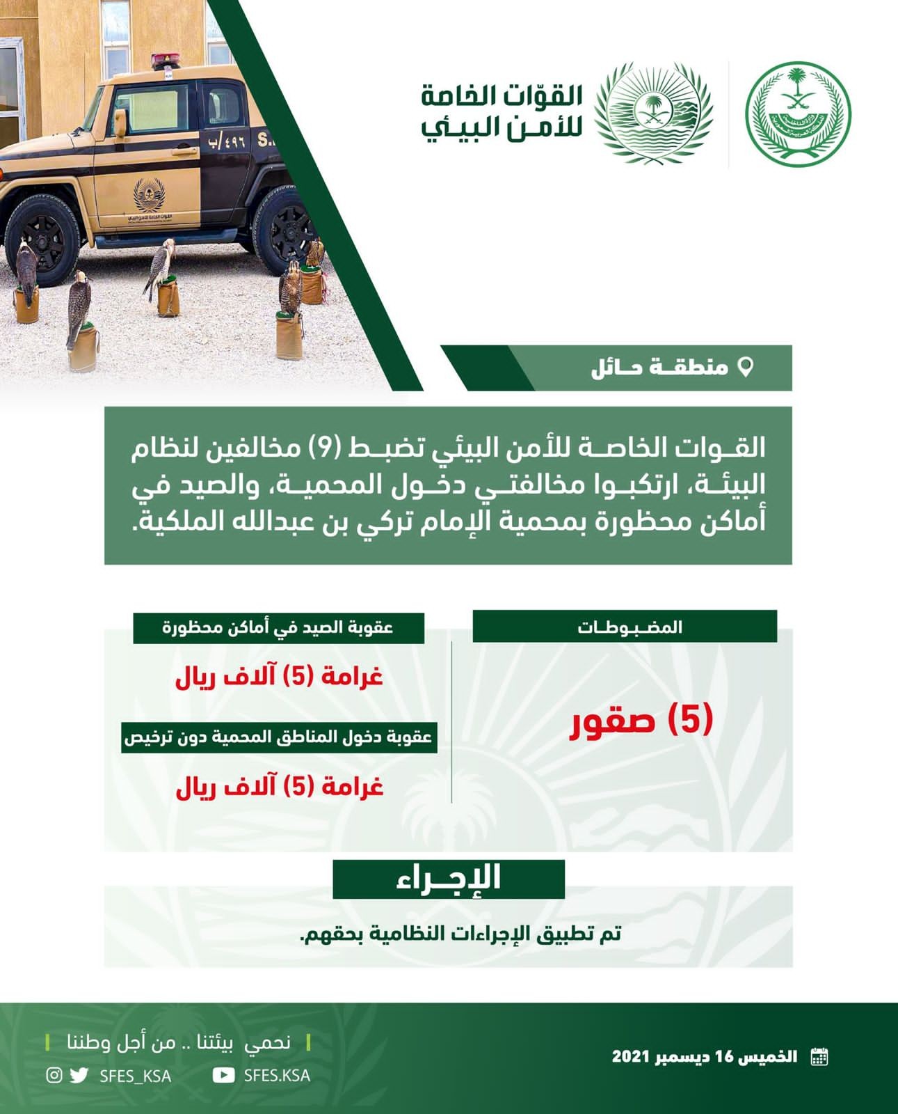 ضبطت القوات الخاصة للأمن البيئي مخالفَين لنظام البيئة، ارتكبا مخالفتي دخول منطقة محمية دون ترخيص، والصيد في أماكن محظورة (بمحمية الإمام تركي بن عبدالله الملكية) في منطقة حائل.