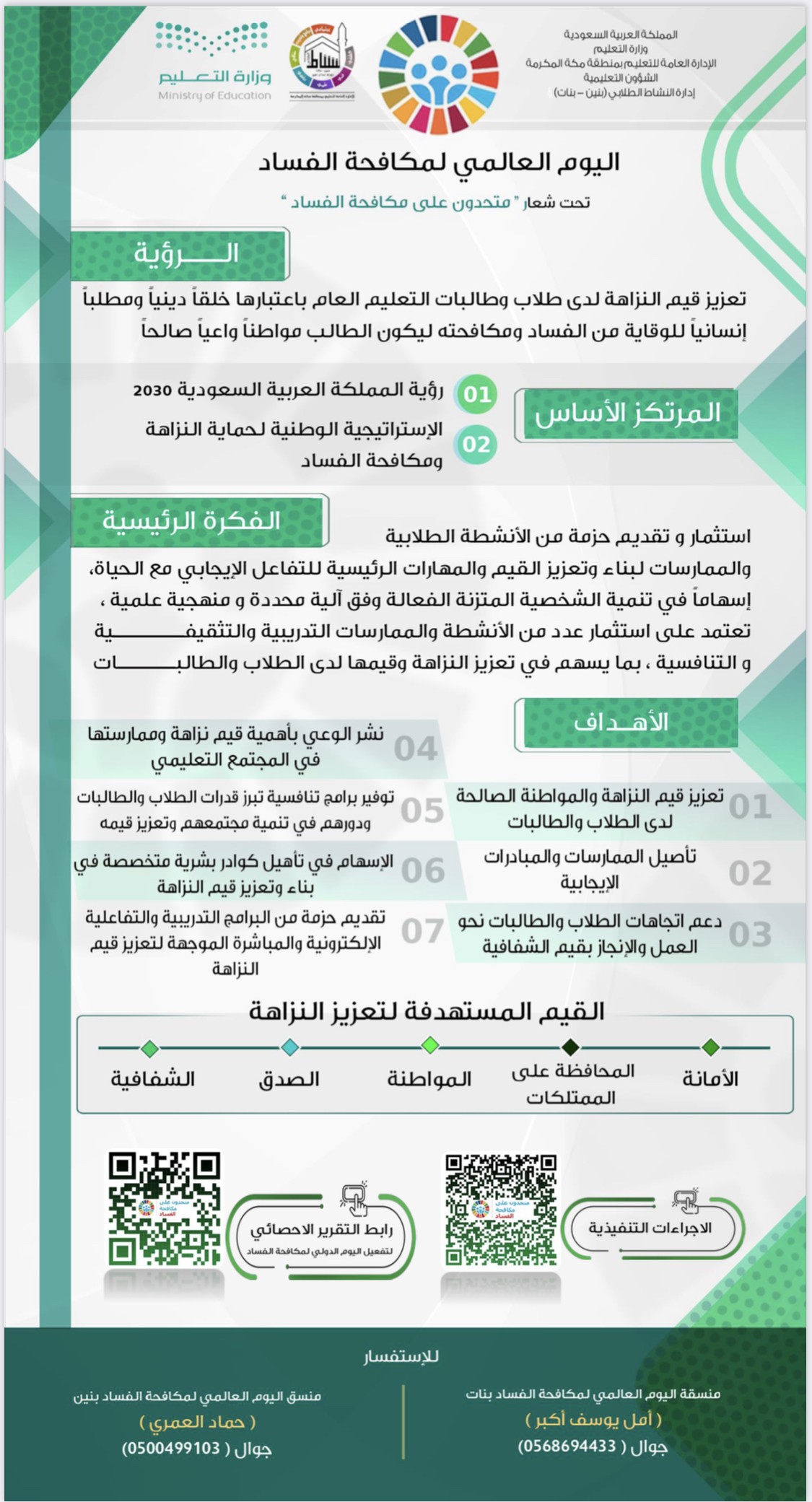 تحقيقا لرؤية المملكة 2030 والاستراتيجية الوطنية لحماية النزاهة ومكافحة الفساد أطلقت الإدارة العامة للتعليم بمنطقة مكة المكرمة ممثلة في إدارة النشاط الطلابي فعالياتها لليوم الدولي لمكافحة الفساد تحت شعار "متحدون على مكافحة الفساد" وذلك بالتعاون مع جميع المدارس ومكاتب التعليم .