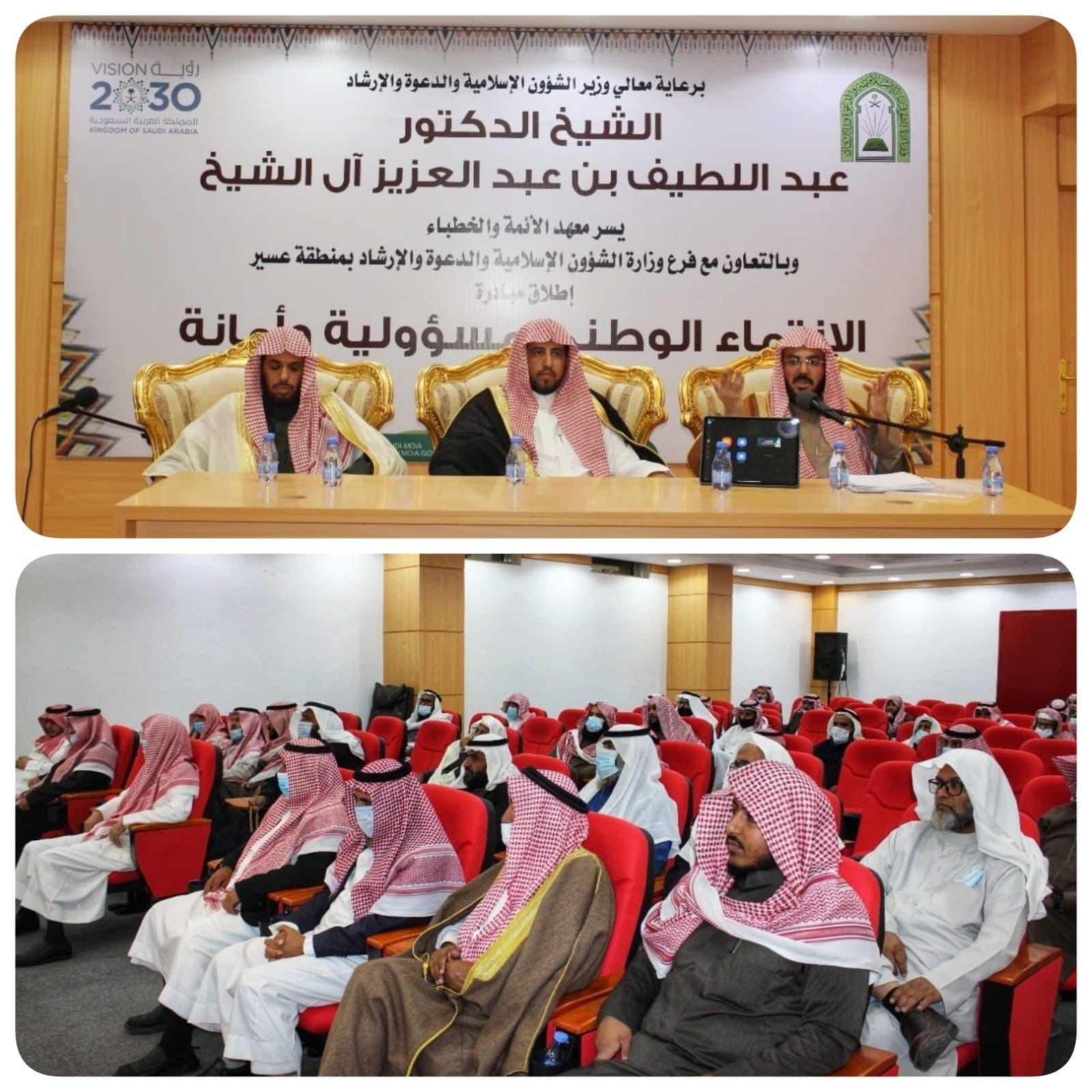 نظم فرع وزارة الشؤون الاسلامية والدعوة والإرشاد بعسير بالتعاون مع معهد الأئمة والخطباء مبادرة "الإنتماء الوطني مسؤولية وأمانة" وإنطلقت فعالياتها يوم الأحد الماضي الثاني والعشرين من شهر جمادى الأولى وإستمرت لمدة يومين في مسرح الفرع.
