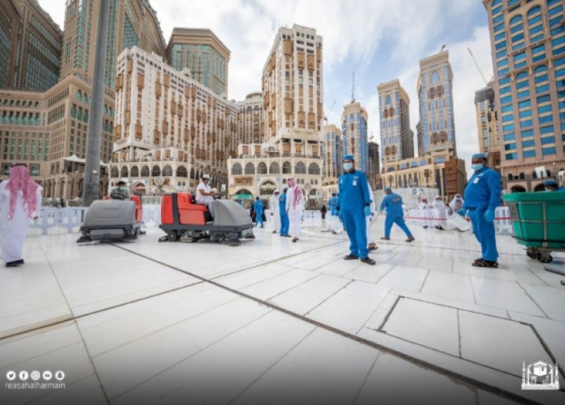 تقوم الرئاسة العامة لشؤون المسجد الحرام والمسجد النبوي، بتكثيف أعمال تطهير المسجد الحرام وسطحه وساحاته ومرافقه وتهيئته للزوّار والمصلين، حيث يتم غسله عشر مراتٍ يومياً، ويقوم بذلك أكثر من (٤٠٠٠) عامل وعاملة وذلك لضمان أداء سير العمل.