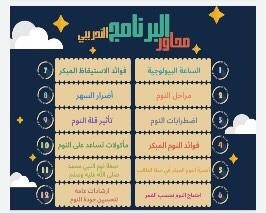 كما تناول البرنامج بعض المحاور المهمة والتي تمثلت في توضيح الساعة البيولوجية وأهميتها، والتعرف على مراحل النوم وفوائده وأهميته، شرح اضطرابات النوم (أنواعها – أسبابها- الوقاية منها)، وكيفية احتساب احتياج النوم بحسب العمر، تحديد المأكولات والمشروبات التي تساعد على النوم، توضيح صفة كيفية نوم النبي محمد صلى الله عليه وسلم، والتعرف على الإرشادات العامة لتحسين جودة النوم .