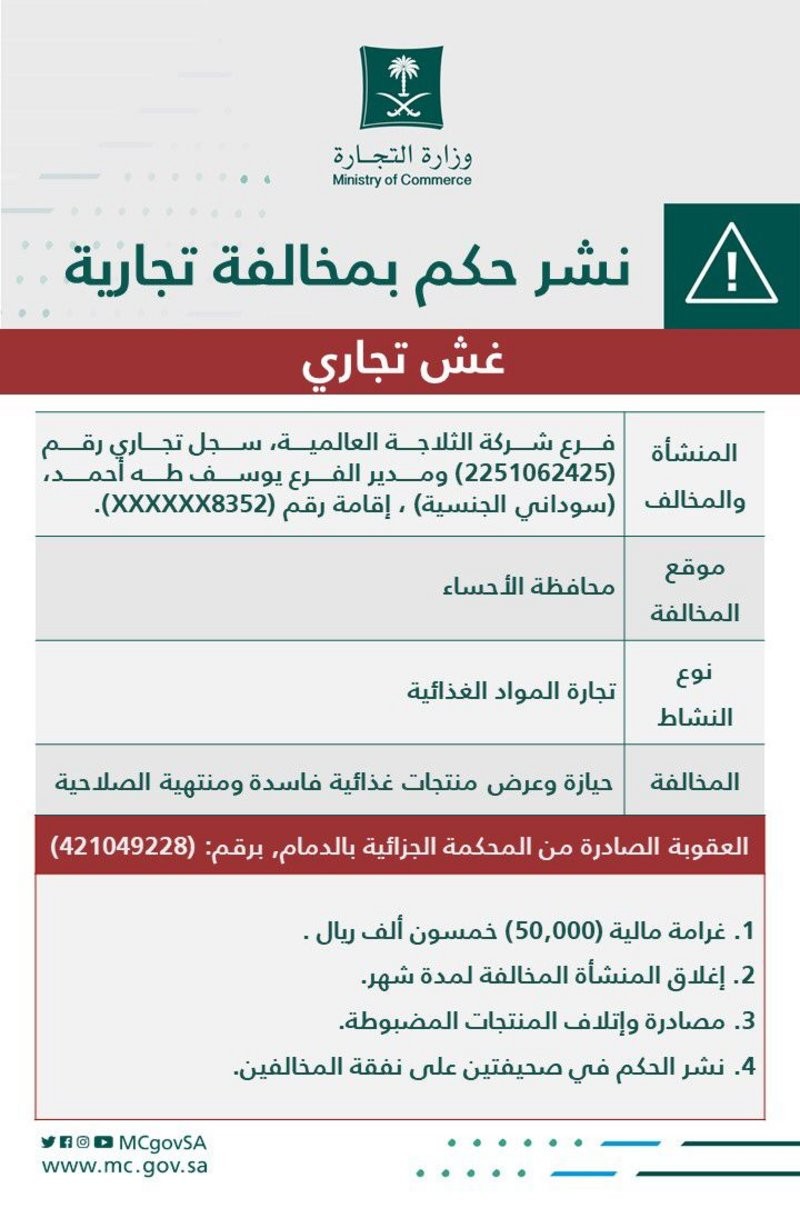 شهّرت وزارة التجارة بفرع شركة تختص بتجارة المواد الغذائية بمحافظة الأحساء بعد صدور حكم قضائي بإدانة المنشأة ومديرها المقيم من جنسية سودانية بمخالفة نظام مكافحة الغش التجاري؛ إثر ضبط لحوم فاسدة ومنتهية الصلاحية معروضة للبيع.