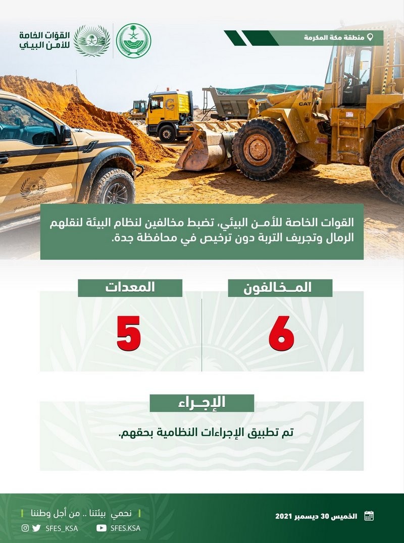 وأوضح المتحدث الرسمي للقوات الخاصة للأمن البيئي الرائد رائد المالكي، أنه ضُبطت 5 آليات تُستخدم في نقل الرمال وتجريف التربة، تعود ملكياتها لمواطن، ويعمل عليها 5 مقيمين من الجنسية اليمنية، وطُبقت الإجراءات النظامية بحقهم.