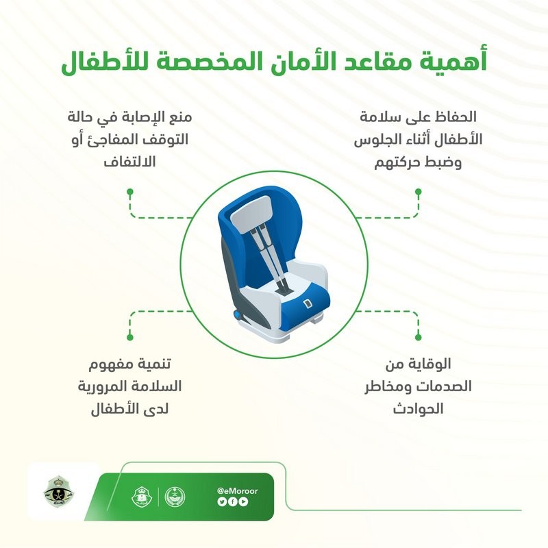 شدد المرور السعودي على أهمية استخدام مقاعد الأمان المخصصة للأطفال بالمركبات؛ حرصًا على سلامتهم.