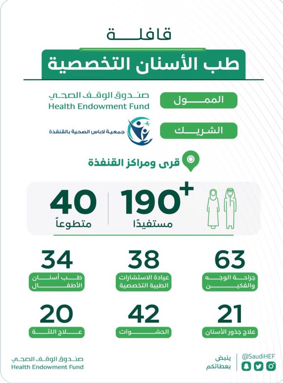 قدم صندوق الوقف الصحي دعمه لقافلة طب الأسنان التخصصية بالتعاون مع جمعية "لا بأس" الصحية؛ لتقديم الخدمات الصحية لأكثر من (190) مستفيداً بعدة مراكز طرفية بمحافظة القنفذة وبمشاركة (40) متطوعًا من الممارسين الصحيين, منهم: (15) طبيب أسنان من ذوي الاختصاص؛ وذلك للإسهام في علاج المرضى من خلال عيادة الاستشارات الطبية التخصصية مثل: التركيبات الثابتة والمتحركة، وزراعة الأسنان، وتقويم وتجميل الأسنان، وعلاج الجذور، وعلاج اللثة، بالإضافة إلى جراحة الوجه والفكين، وأسنان الأطفال، والحشوات.