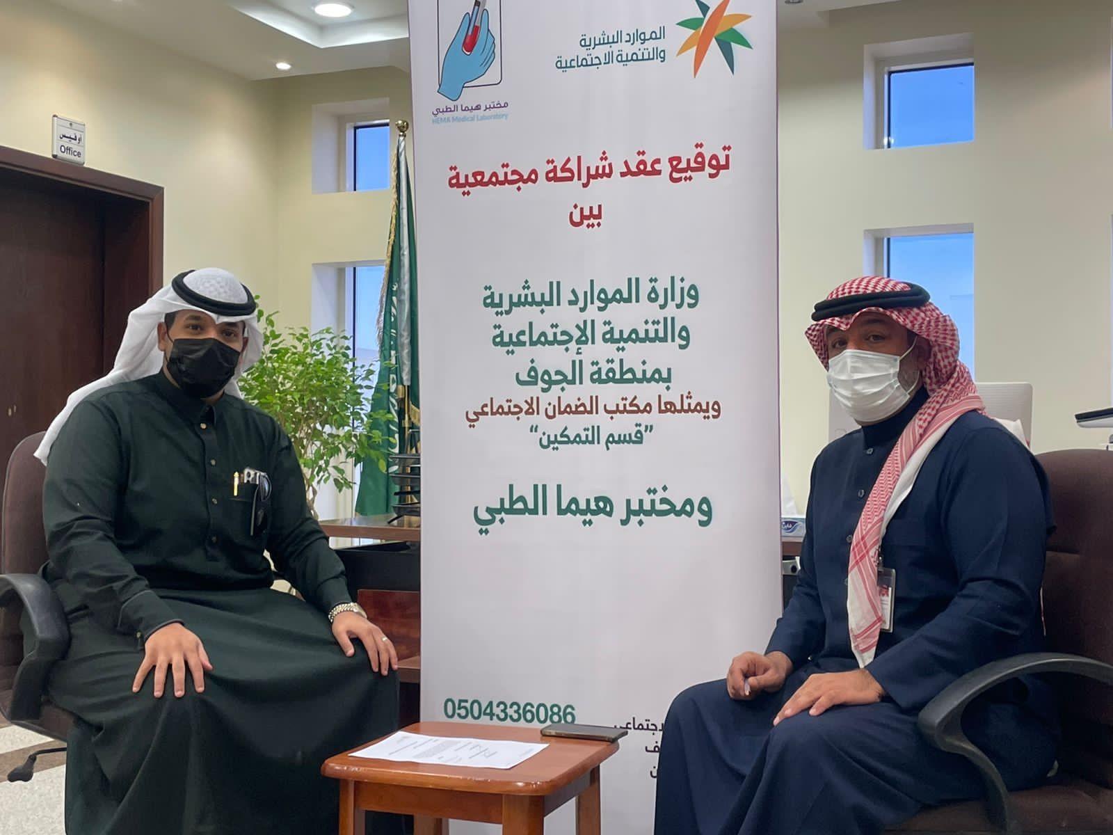 تحقيقا لمبدأ تفعيل الشراكة المجتمعية بين القطاعات الحكومية والقطاع الخاص تم توقيع عقد شراكه مجتمعيه بين المكتب الرئيسي للضمان الإجتماعي بمنطقة الجوف مع مختبرات هيما الطبي بمخافظة دومه الجندل ، تم التوقيع من قبل الضمان الاجتماعي ممثلا بمسؤل قسم التمكين بالمكتب الإستاذ/عبدالرحمن الفهيقي ومدير مختبرات هيما الطبي /عبدالاله مفرح الفهيقي .