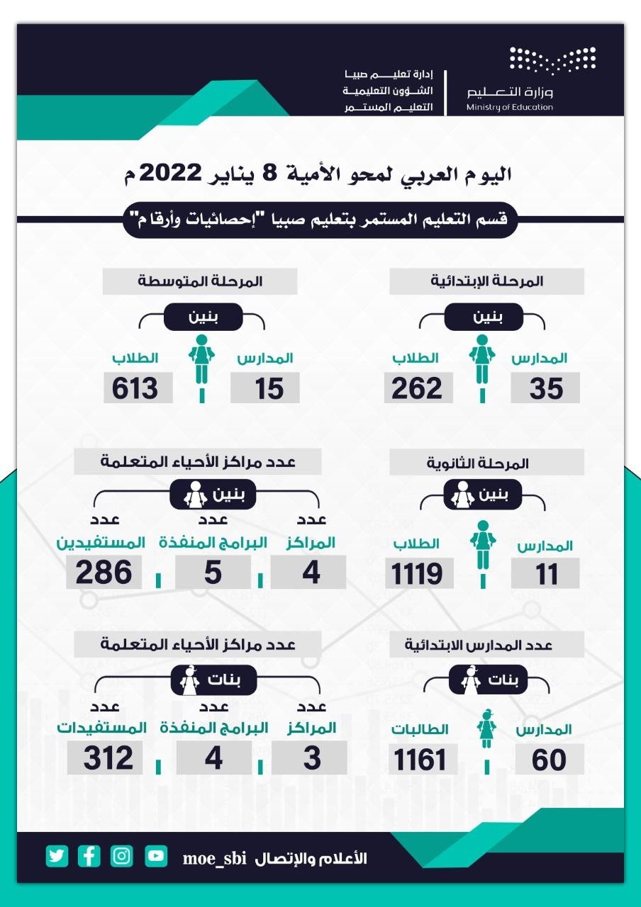 تشارك إدارة تعليم صبيا في الاحتفاء بـ اليوم العربي لمحو الأمية، 8 يناير" 2022م" تحت شعار "محو الأمية بناء للإنسان وتنمية للأوطان .