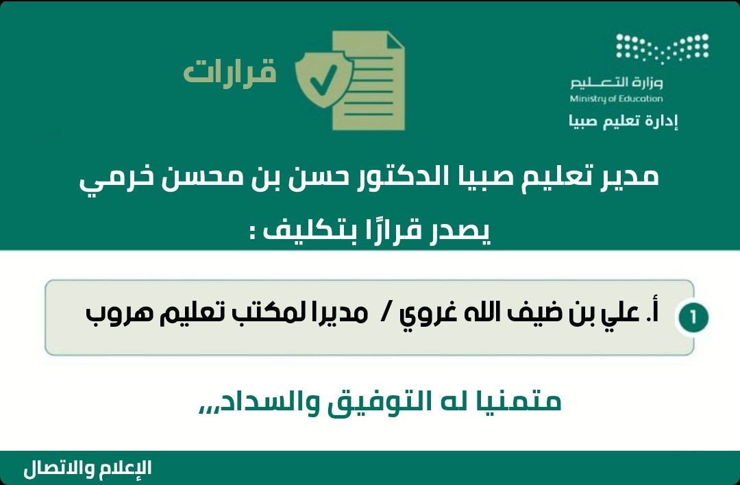 أصدر مدير ⁧‫تعليم صبيا‬⁩ د.حسن بن محسن خرمي قرارًا إداريًا بتكليف علي بن ضيف الله غروي مديرا لمكتب تعليم هروب، مثمنا الجهود المبذولة من مدير مكتب التعليم السابق حسن بن إبراهيم قرادي .