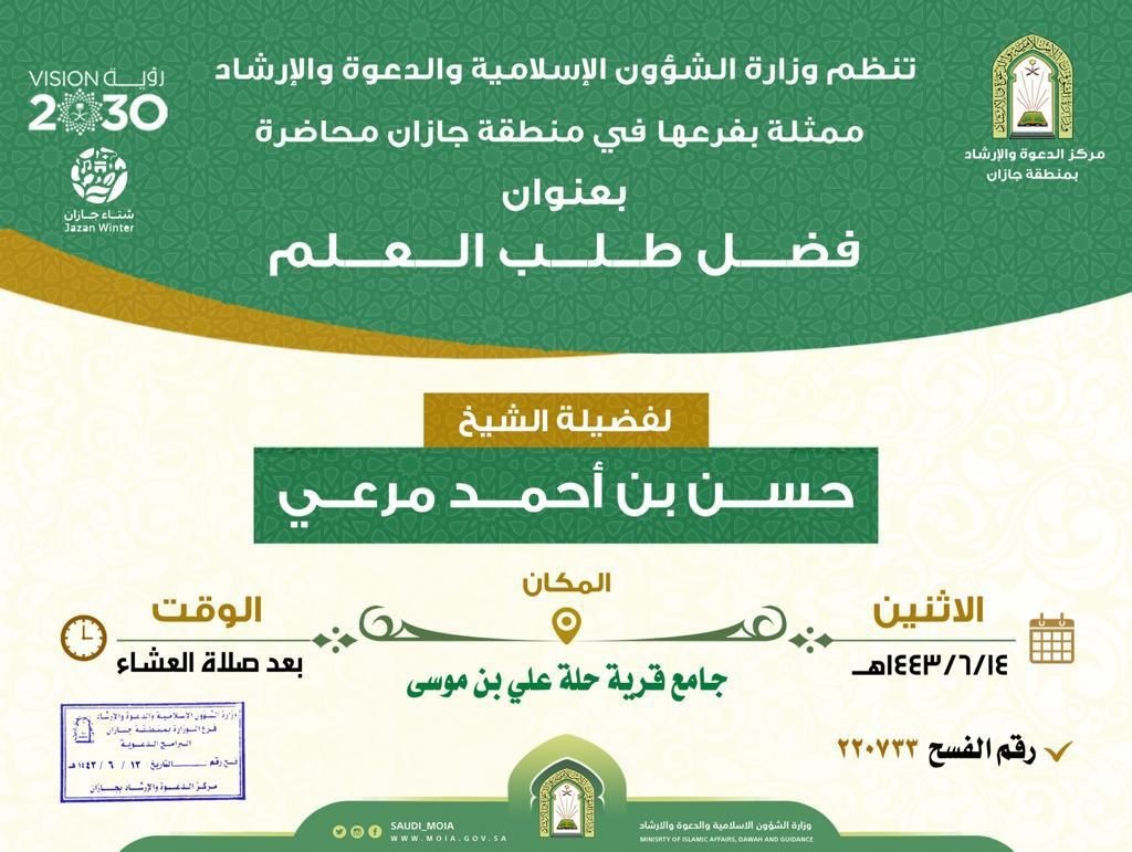 نظم فرع وزارة الشؤون الإسلامية والدعوة والإرشاد في منطقة جازان مساء أمس الإثنين الرابع عشر من شهر جماد الآخرة محاضرة دعوية ضمن البرنامج الدعوي المصاحب لفعاليات شتاء جازان ٢٠٢٢ م والتي جاءت بعنوان ( فضل طلب العلم ) ألقاها فضيلة الشيخ حسن بن أحمد مرعي في جامع حلة علي بن موسى التابعة لمحافظة صبيا بين فضيلته بعض فضائل طلب العلم وذكر منها أن العلم ميراث الأنبياء وأن العلم طريق للجنة التي يتمناها الجميع وكذلك أن من حضروا مجلس العلم مغفوراً لهم بإذن الله وكذلك أن العلماء مقدمون على غيرهم من البشر كما ذكر مرعي أو طلب العلم سبب لحصول رضى الله عز وجل كما أن العلم متساو مع الجهاد في سبيل الله .