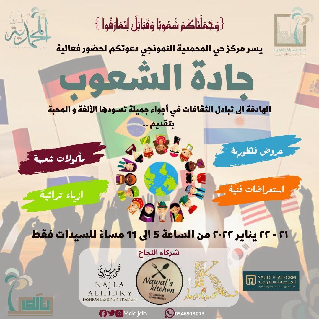 تتنافس سبع دول مختلفه بينها السعودية على عرض أجمل أزياءها.. وأشهى مأكولاتها.. خلال فعالية (جادة الشعوب) التي ينظمها مركز المحمدية النموذجي أحد مراكز الأحياء بجدة، اليوم الجمعة ،وعلى مدار يومين، بهدف تبادل المعارف والخبرات والثقافات بين سكان الحي من مواطنين ومقيمين، واستعادة روح الألفة التي كان عليها الجداويين في السنوات السابقة، في أجواء تسودها المحبة.