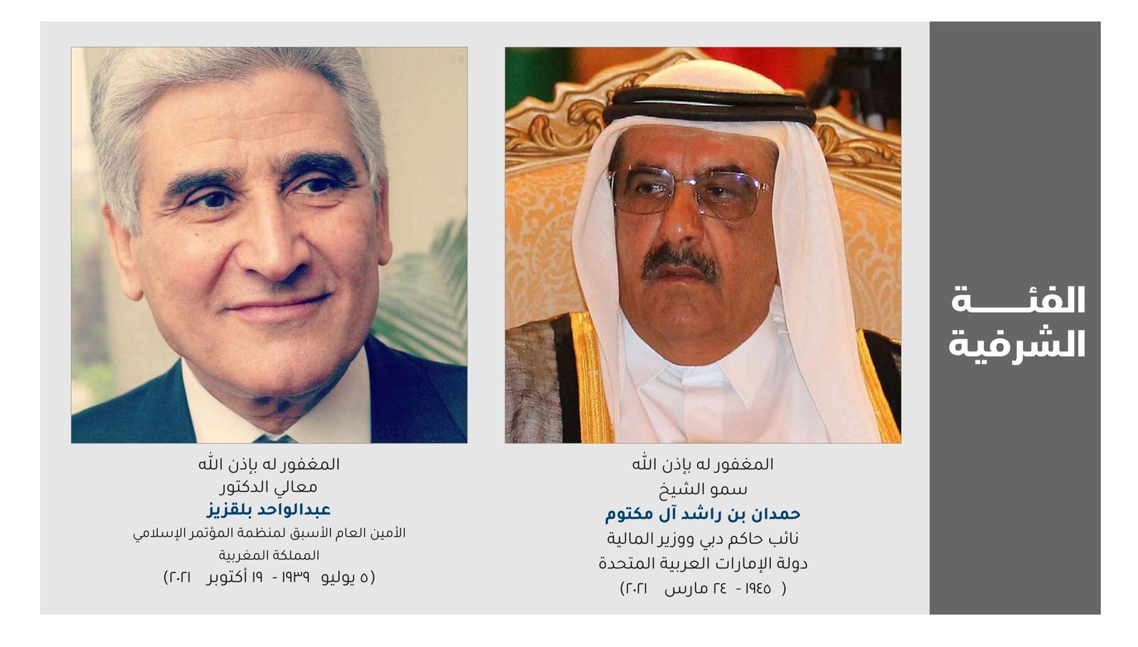 وقد شملت هذه الفئة شخصيتين عربيتين كان لهم تاريخ حافل من العطاء هما :المغفور لها بإذن الله: سمو الشيخ مكتوم بن راشد آل مكتوم نائب حاكم دبي وزير المالية بدولة الإمارات العربية المتحدة ، وكذلك معالي الدكتور عبدالواحد بلقزيز الأمين العام الثامن لمنظمة المؤتمر الإسلامي من المملكة المغربية.
