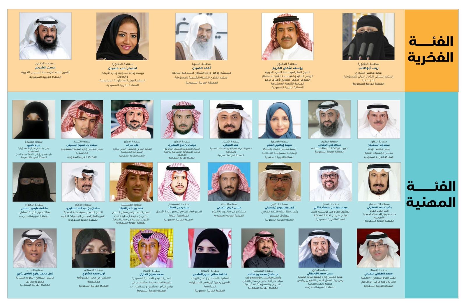 وقد ضمت القائمة في نسختها الثالثة شخصيات سعودية رفيعة المستوى ومؤثرة في مجالات المسؤولية المجتمعية. ففي الفئة الفخرية ضمت القائمة كل من : الدكتورة زينب أبوطالب عضو مجلس الشورى السعودي و الدكتور يوسف الحزيم الأمين العام لمؤسسة الأميرة العنود الخيرية ، و الشيخ أحمد الصبان مستشار ووكيل وزارة الشؤون الإسلامية الأسبق و الدكتورة انتصار فلمبان السفير الدولي للمسؤولية المجتمعية ، إضافة إلى الدكتور حسن الشريم الأمين العام لمؤسسة السبيعي الخيرية.