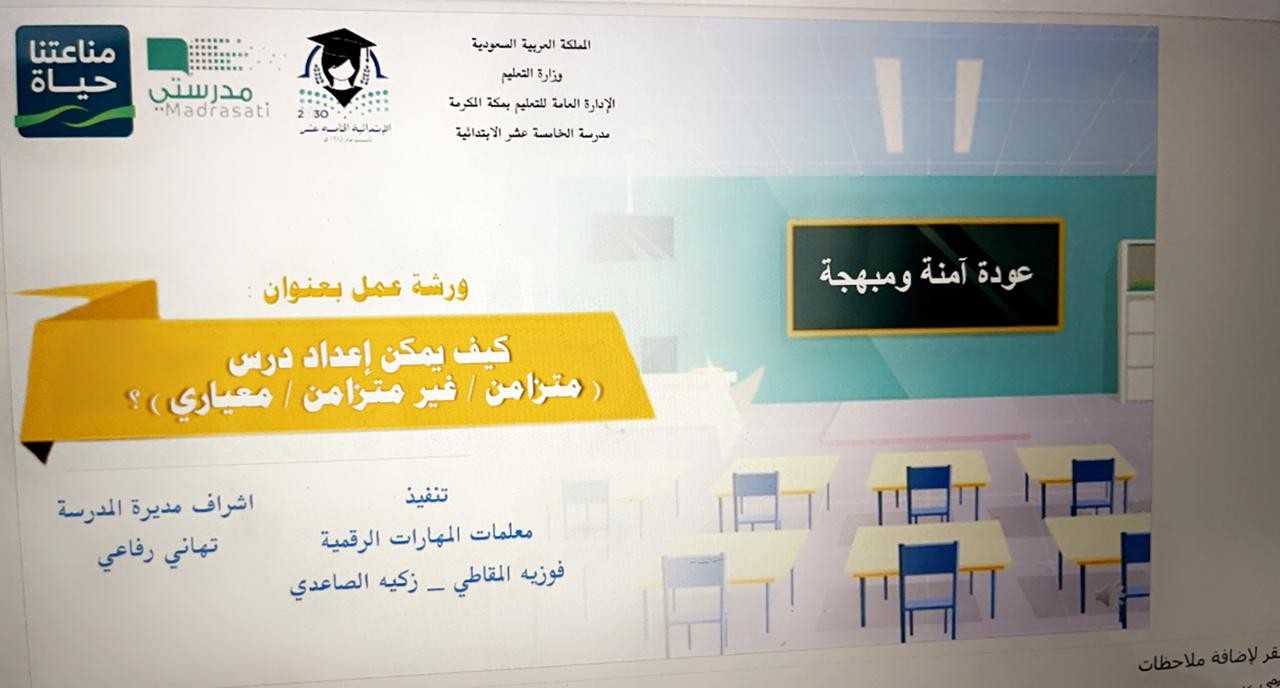 نفذت الابتدائية الخامسة عشر التابعة لمكتب تعليم شمال مكة بالإدارة العامة للتعليم بمنطقة مكة المكرمة يوم الخميس الموافق 16 / 6 / 1443هـ، ورشةً تدريبيةً بعنوان (كيف يمكن إعداد درس (متزامن / غير متزامن / معياري) نفذهُ كُلاً من معلمتي المهارات الرقمية فوزيه المقاطي وزكية الصاعدي