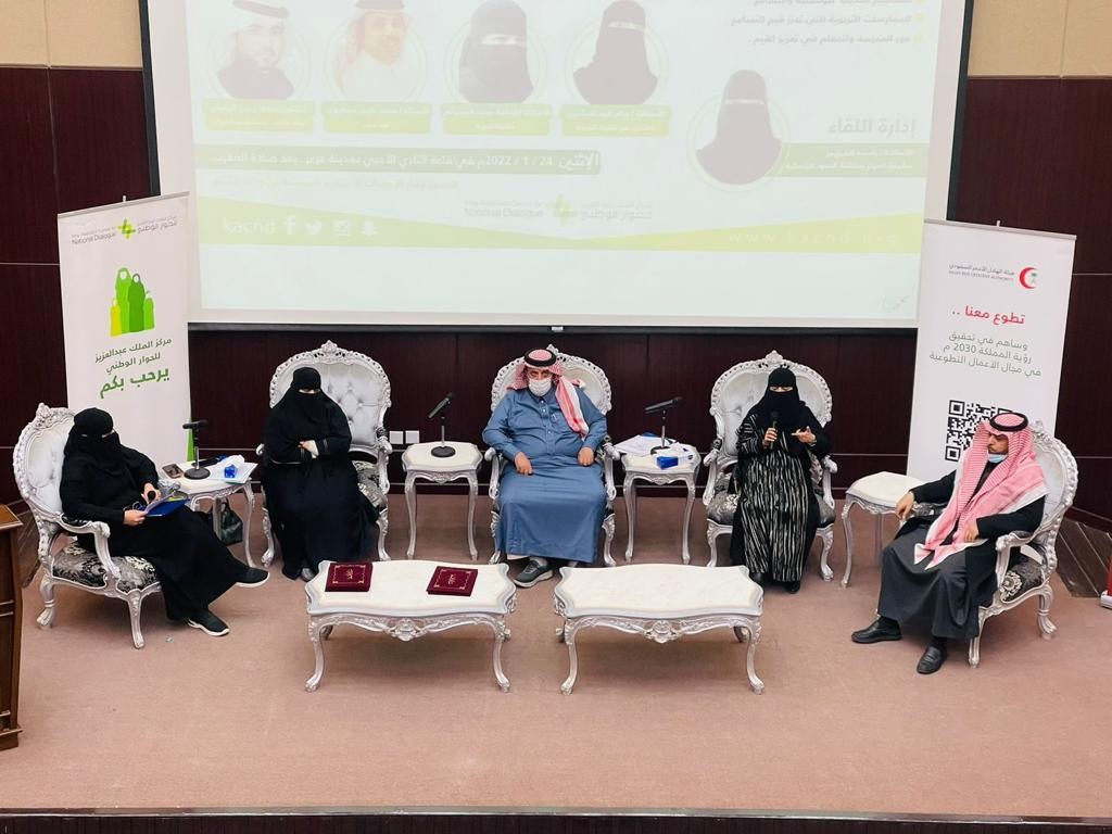 في عدة محاور حيث تحدث الدكتور سعود جبيب الرويلي عن المفاهيم الحديثة في الوسطية والتسامح وذكر بأن مفاهيم الوسطية ليست جديدة وإنما في فترة من الزمن غيبت بسبب بعض السلوكيات والمفاهيم الخاطئة ولكن الان تعود للفهم الصحيح كما تطرق الدكتور على ان القيم تسير راسيًا عمقًا للتاريخ وأفقيًا وفق لاختلاف المجتمعات كذلك شاركت الاستاذة مرام فهد المشاري بالحوار بمحور الممارسات التربوية في تعزيز القيم بقولها هناك العديد من الممارسات التي تعزز القيم والوسطية في المجتمع ولابد أن تكون المدرسة القدوة للجميع كذلك تحدث الأستاذ محمد داود العطيوي عن دور المدرسة في تعزيز الوسطية وذكر بعض النماذج الحية في تجسيد الوسطية كما تطرقت الاستاذة فاطمه الشمراني عن دور المعلم و ربطها باخلاقيات مهنة التعليم . وقد ادارت الحوار مشرفة مركز الملك عبدالعزيز للحوار الوطني الاستاذة باسمه الضويمر كما اثري اللقاء من خلال مداخلات من الحضور كان لها الاثر الجيد على الحوار وفي الختام كرم مشرف الحوار الوطني الأستاذ خالد الفريجي الرويلي المشاركين في الحوار كما كرم مدير عام فرع هيئة الهلال الاحمر بمنطقة الحدود الشمالية الدكتور ثامر اسماعيل يتيم .