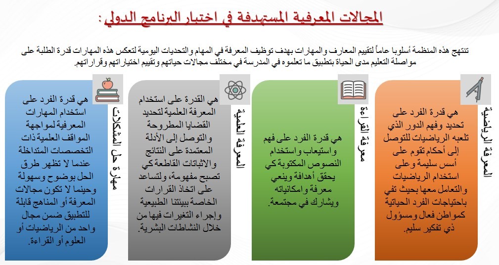 نفذتها مشرفات العلوم الطبيعية بالمكتب بهدف رفع نتائج الطالبات في الاختبارات الدولية والمركزية من خلال مناقشة وعرض نتائج اختبارات PISA لجميع المدارس، والتعريف بمعنى اختبار بيزا وأهدافه والفئة المستهدفة في الاختبار، شرح الكفاءات والكفايات العلمية لاختبارات العلومالتي تتناولها اختبارات PISA .توضيح المجالات المعرفية المستهدفة في اختبار البرنامج الدولي PISA . ، عرض أنواع الأسئلة ومستويات كفاءة الاتقان في اختبارات PISA