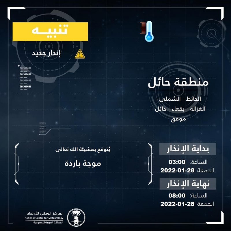 وكذلك تشهد حائل موجة باردة، وتشمل الحالة الحائط والشملي والغزالة وبقعاء وحائل وموقق، وتستمر حتى الساعة الـ 08.00 من صباح الجمعة.