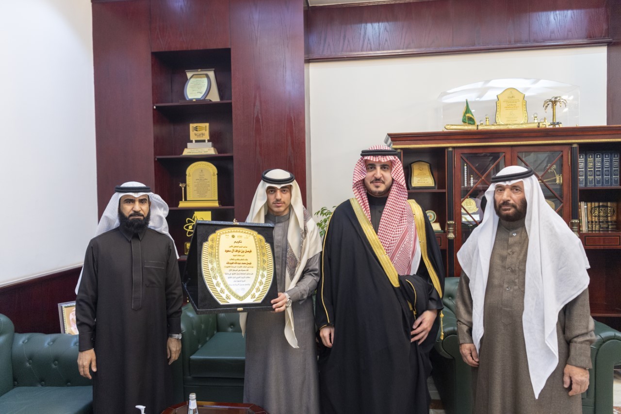 كرم صاحب السمو الملكي الأمير فيصل بن نواف بن عبدالعزيز أمير منطقة الجوف، في مكتبه بمحافظة القريات اليوم، الطالب فيصل بن عبدالرحمن القحطاني، بمناسبة تفوقه في الرياضيات على مستوى المملكة والخليج، بمسابقة مكتب التربية العربي لدول الخليج في دورته الـ 14.