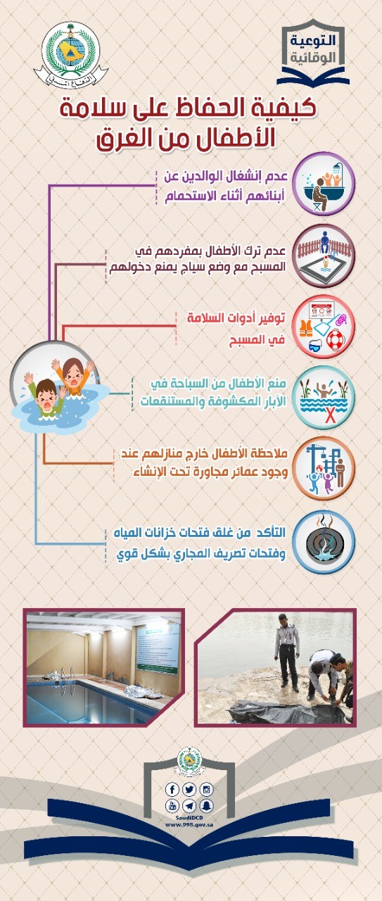 منوهاً في الوقت ذاته بمراقبة اطفالهم في المسابح والتاكد من مناسبتها لاعمارهم بعد التاكد من توفر وسائل السلامة واطواق النجاة ، سواء كان ذلك في المدن الترفيهية، أو الاستراحات، أو الشاليهات، وعدم ترك الأطفال يسبحون بمفردهم تحنباً لتعرضهم لمخاطر الغرق لا سمح الله.