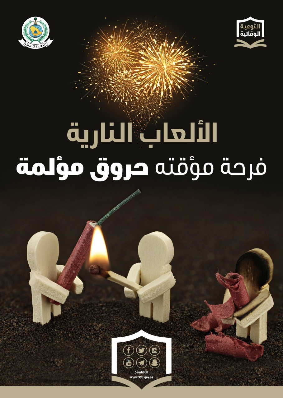 تدعوا الإدارة العامة للدفاع المَدَنِيّ بمحافظة ينبع الى اتخاذ الحيطة والحذر من مخاطر الألعاب والمفرقعات النارية التي يلهو بها الشباب والأطفال ، خلال احتفالهم بعيد الفطر المبارك .