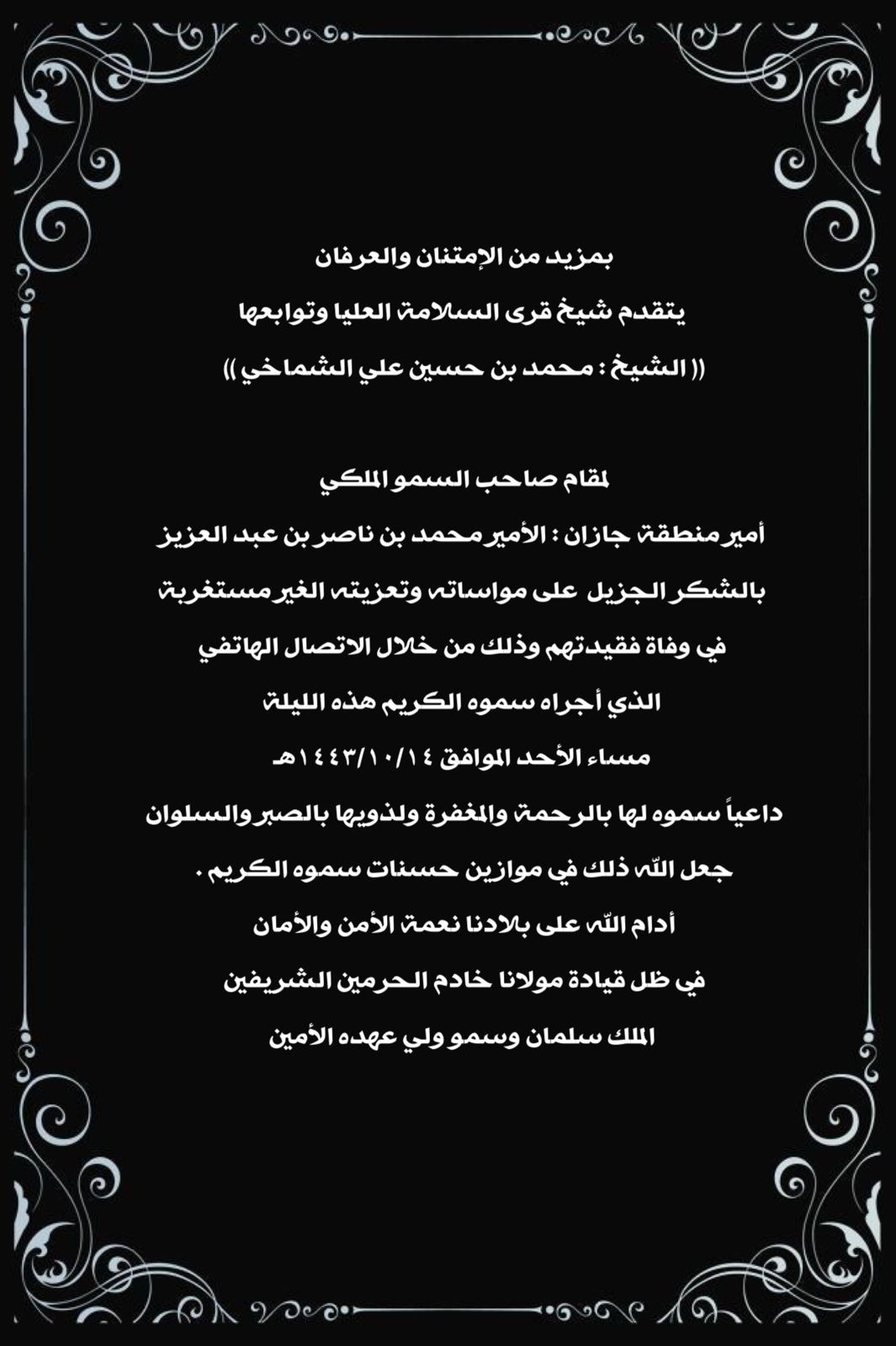 لمقام صاحب السمو الملكي أمير منطقة جازان : الأمير محمد بن ناصر بن عبد العزيز بالشكر الجزيل على مواساته وتعزيته الغير مستغربة في وفاة فقيدتهم وذلك من خلال الاتصال الهاتفي الذي أجراه سموه الكريم هذه الليلة مساء الأحد الموافق ١٤٤٣/١٠/١٤هـ داعياً سموه لها بالرحمة والمغفرة ولذويها بالصبر والسلوان جعل الله ذلك في موازين حسنات سموه الكريم .