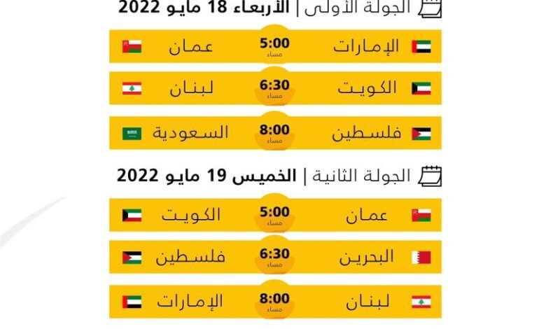 ومن المقرر أن تنطلق المنافسات يوم الأربعاء المقبل بإقامة 3 مواجهات تجمع منتخبنا الوطني مع فلسطين، في حين تلتقي الإمارات مع عمان والكويت مع لبنان.