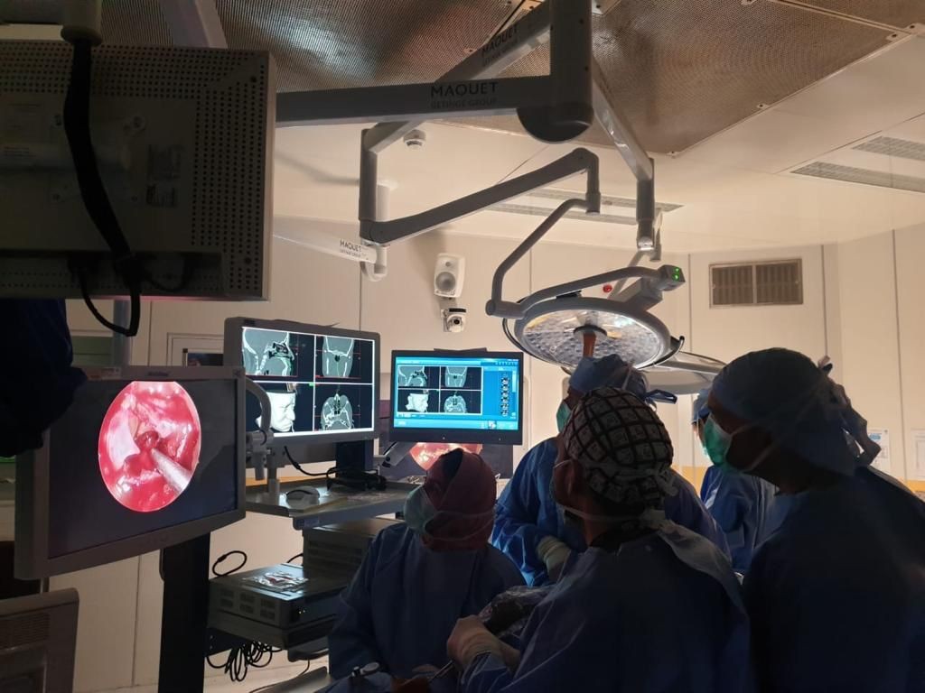 وأوضح استشاري مناظير الجيوب الأنفية وقاع الجمجمة الدكتور نايف الفتني ان مريض يبلغ من العمر (٧٢ عاماً) كان يعاني من الألم من الجيوب الانفية وخلل في وظائف الغدة النخامية، حيث تم تشخيص المرض والذي يعتبر ورم في الدماغ في منطقة الغدرة النخامية والذي كان يشتكي من ضعف البصر في العين اليسرى نتيجة ضغط الورم على عصب البصر وبفضل الله ومن ثم بجهود الفريق الطبي المكون من جراحة الانف والاذن والحنجرة وايضا من جراحة المخ والأعصاب تم ازالة الورم بالكامل باستخدام الجهاز الملاحي الجراحي دون اصابة لعصب البصر أو إصابة للشريان السباتي الرئيسي للدماغ وتعافى المريض بشكل كامل وخرج من المستشفى بصحة وسلامة .