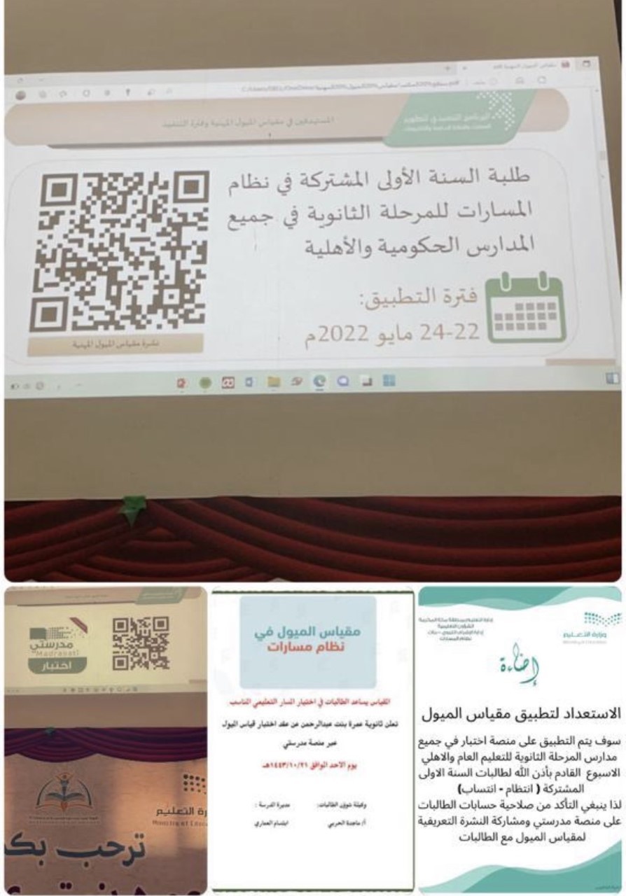نفذت ثانوية عمرة بنت عبد الرحمن التابعة لمكتب تعليم شمال مكة بالإدارة العامة للتعليم بمنطقة مكة المكرمة يوم الخميس الموافق 17 / 10 / 1443هـ، اختبار الميول والتسكين لنظام المسارات من قبل وكيلة شؤون الطالبات ماجدة الحربي تحت إشراف مديرة المدرسة ابتسام العماري.