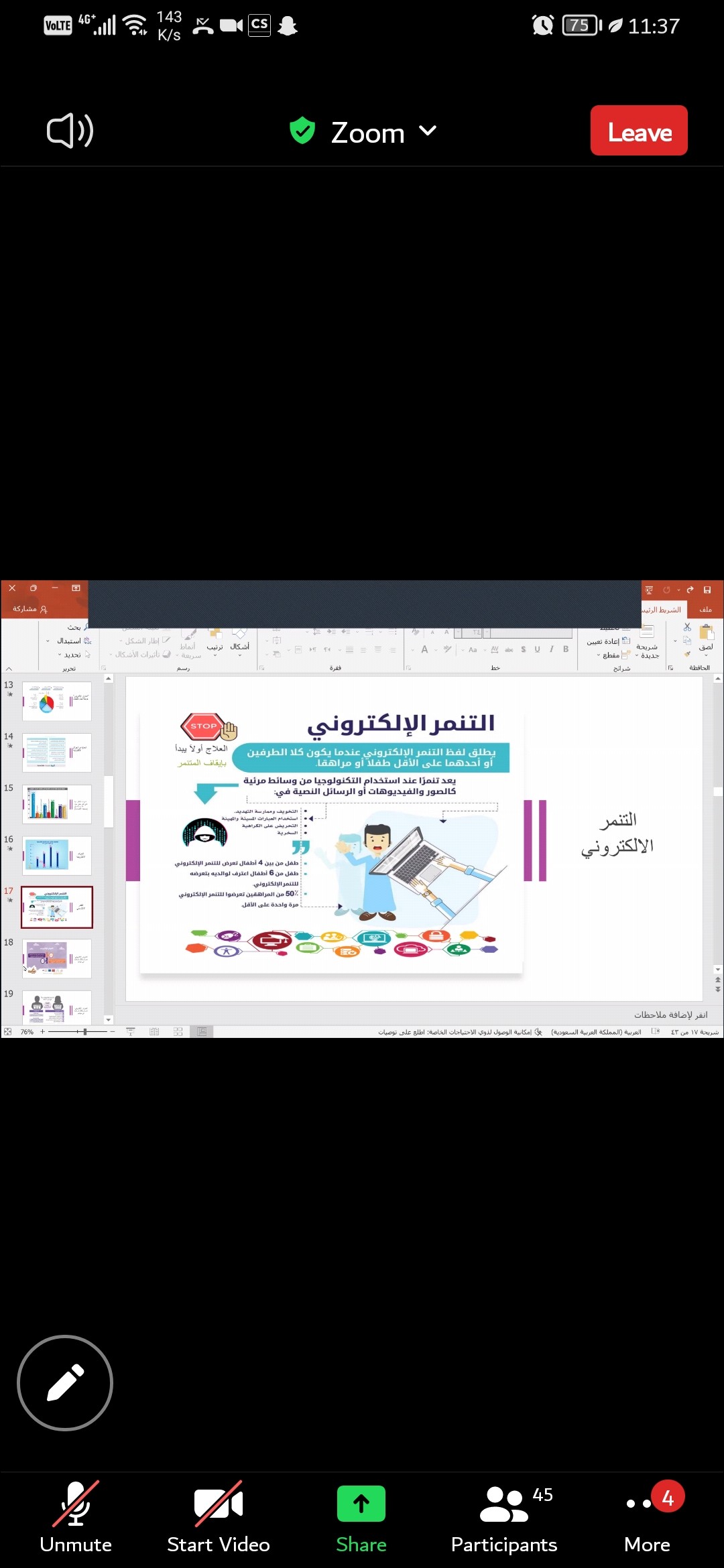 أقامت شعبة التوجيه والإرشاد بمكتب التعليم غرب مكة بالإدارة العامة للتعليم بمنطقة مكة المكرمة يوم الاثنين 22/10/1443هـ ورشة تعريفية لشرح آ لية تنفيذ مبادرة الحملة التوعوية المكثفة تحت عنوان: لا للمخالفات؛ بهدف التوعية بالمخالفات السلوكية عامةً و التركيز على الأكثر شيوعًا في المدرسة للحد من وقوع الطالبات فيها، وقد تم التنفيذ في قاعة التدريب بمكتب غرب مكة عبر قاعة افتراضية في تطبيق الزووم، وكان عدد الحاضرات ( 43 ) موجهة طلابية.